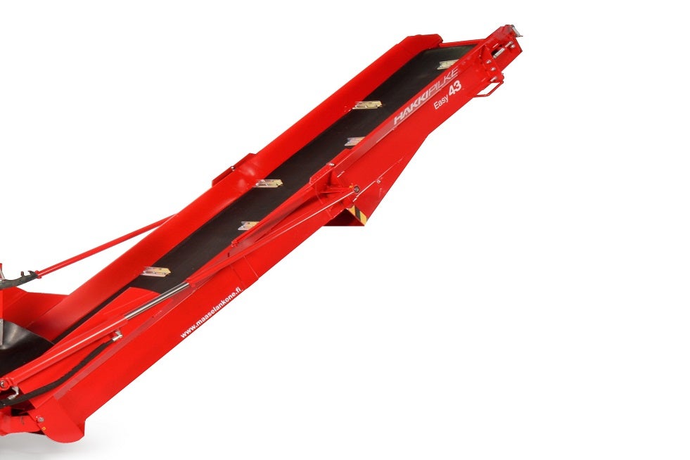 Extra bred elevator som ger utmatningstransportören ytterligare kapacitet vid körning av grovt material. Den bredare elevatorn kommer som standard med hydraulisk höjdreglering.