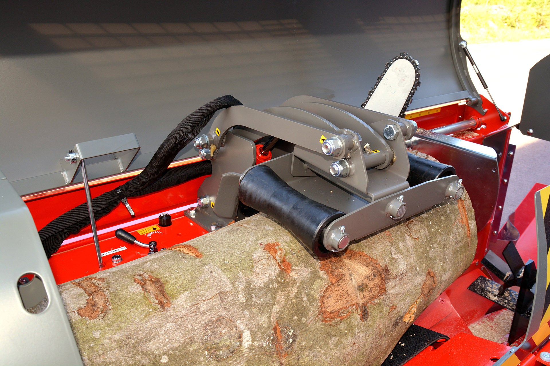Den hydrauliska stockhållaren möjliggör enkel kapning av virke av alla storlekar.