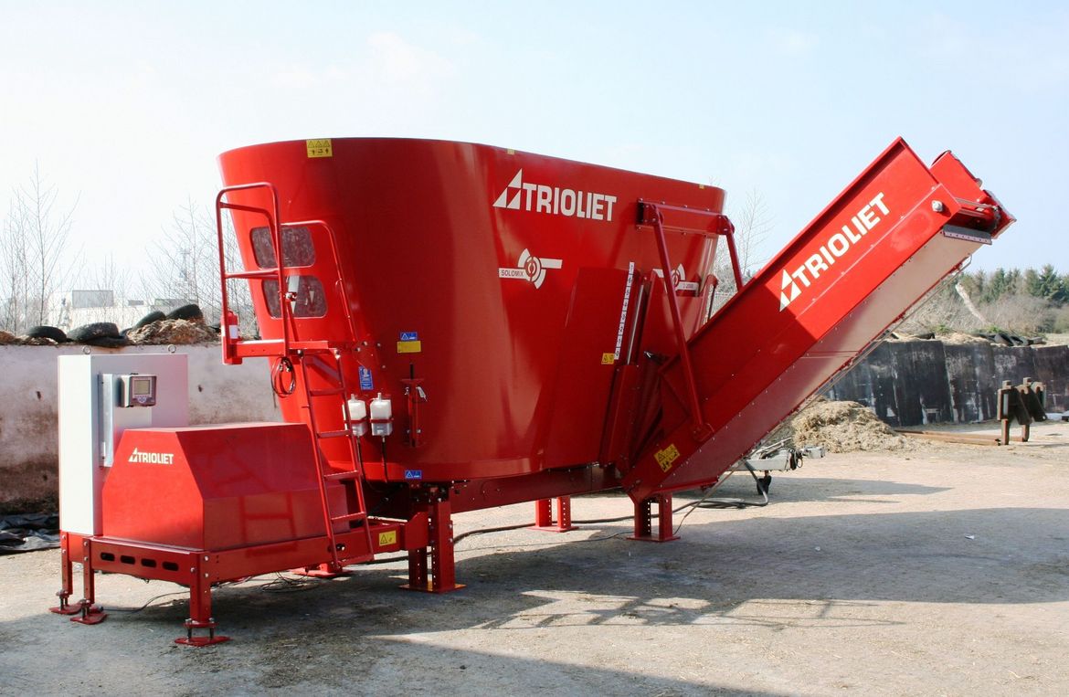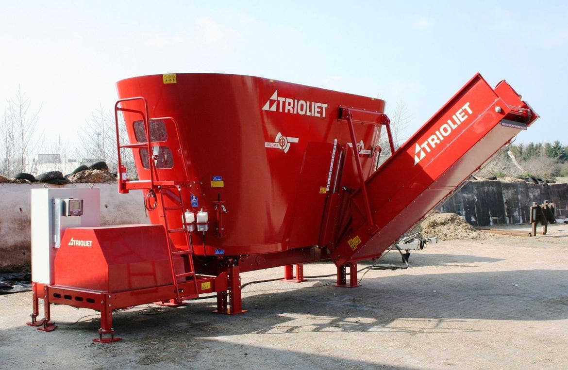 Trioliet levererar blandaren komplett från fabrik – provkörd och utrustad med motor, styrning och frekvensstyrning. Den monteras enkelt i stallet och kräver endast elanslutning för drift.